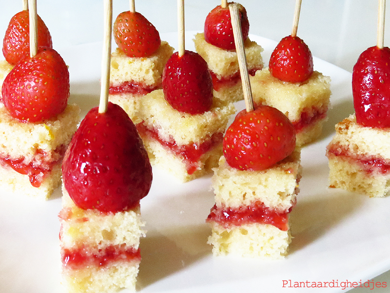 Doe bij ongeveer ⅓ cup poedersuiker een scheutje sojamelk en roer goed. Bedruip de stukjes cake aan de bovenkant met dit suikermengsel. Leg op alle stukjes een aardbei en zet vast met een satéprikker.