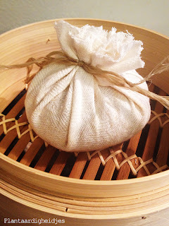 Maak er een ronde bal van en wikkel deze in een kaasdoek, of een dunne schone theedoek. Bind vast met keukendraad en stoom de bol voor ongeveer 40 minuten (controleer goed of er steeds voldoende water in de pan zit).