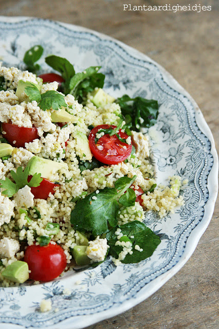 Warme couscous salade met waterkers, avocado en tofu "feta"