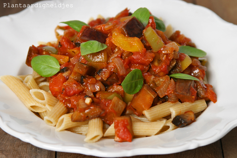 Saus op smaak brengen met zout en peper, serveren met de pasta en bestrooien met basilicum blaadjes.